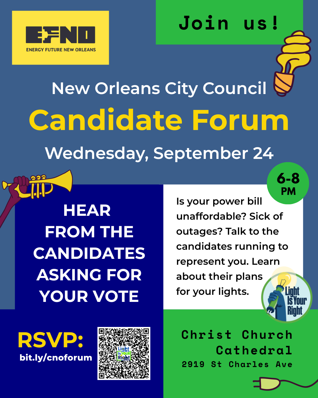 At the forum, candidates addressed some of the biggest questions facing our city, including how the Council can regulate Entergy New Orleans and Delta Utilities to keep bills affordable and lights on, what it will take to improve our grid to better withstand storms and extreme weather, how the Council can ensure transparency and accountability, and more.